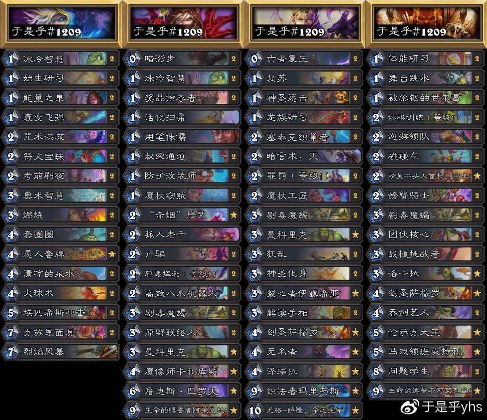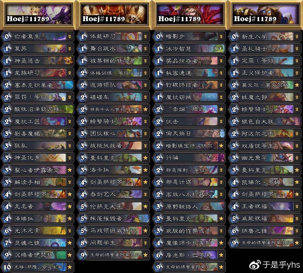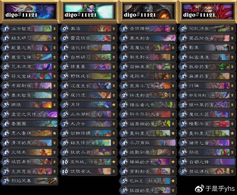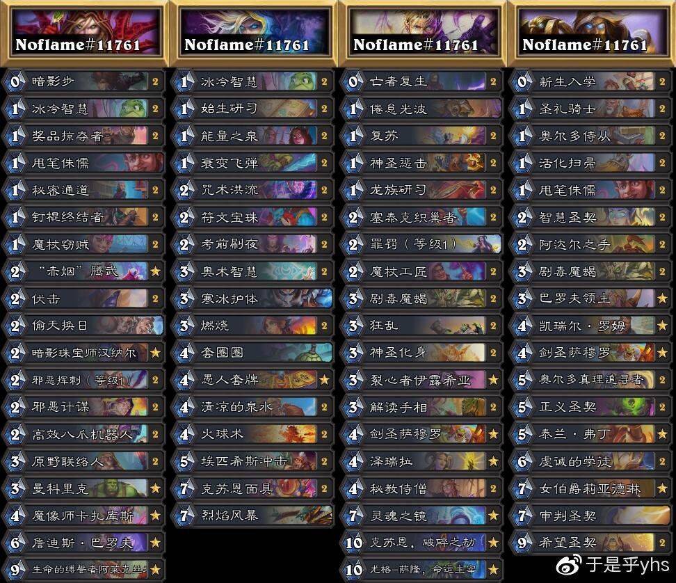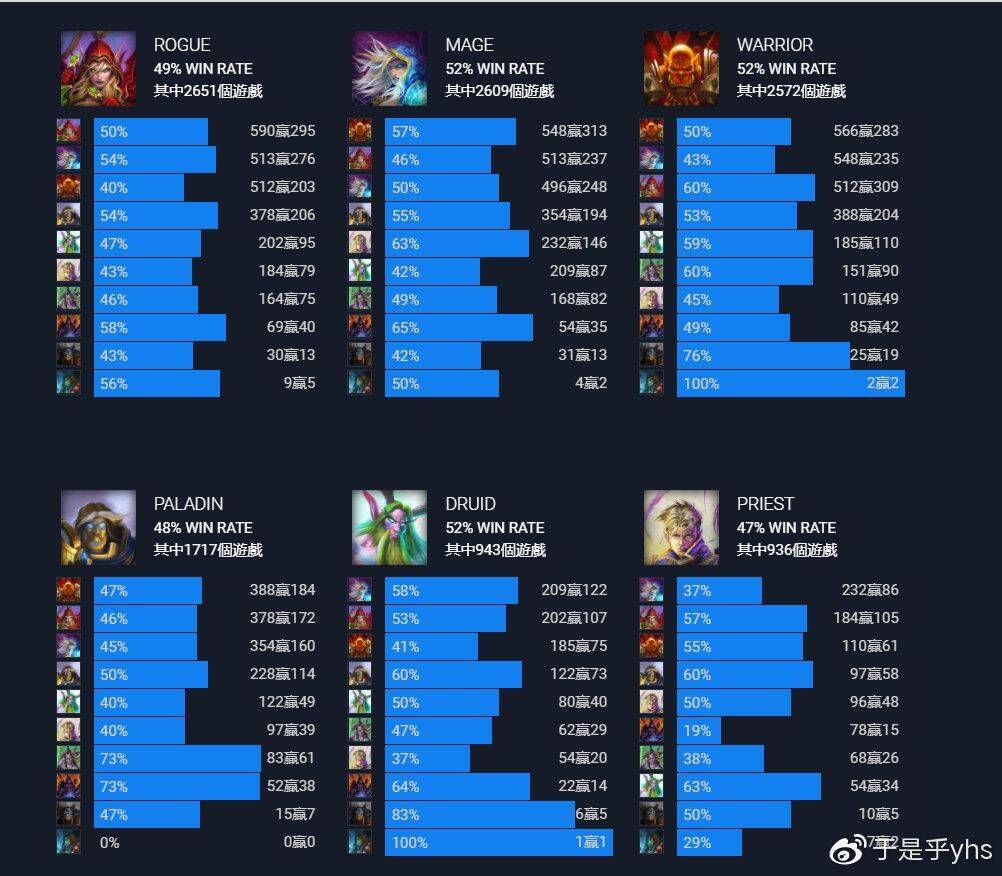 本次比赛,笔者觉得自己最大的背锅位是法师,虽然大数据上法师的胜率还算不错,但是如果运气稍差,就是一个三关,而且毫无操作空间,只能“人为刀俎,我为鱼肉”。也是笔者前三轮1-2的一个根源。但是综合来看,牧师还是吃ban最多的职业,法师、战士和盗贼的胜率也令人满意。所以笔者认为征服4ban1赛制下,比较合适的组合是法师、牧师、刀贼和战士。
