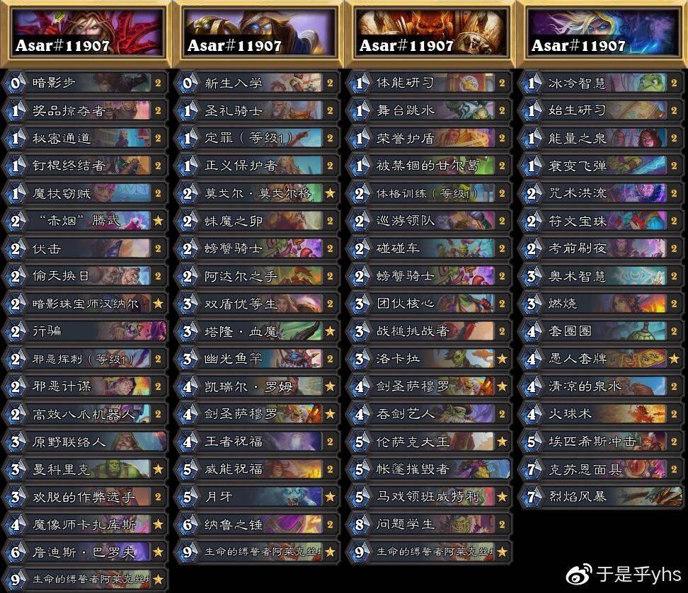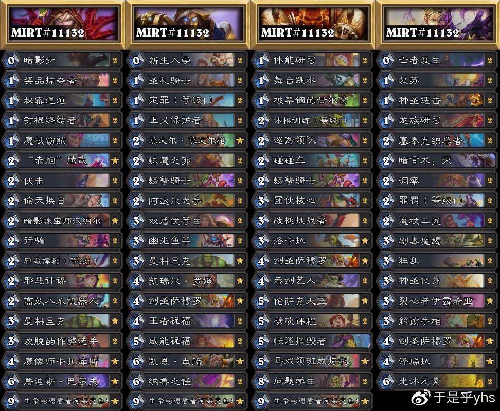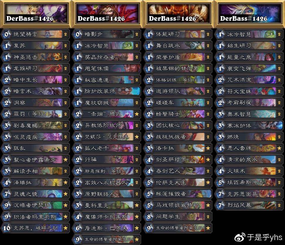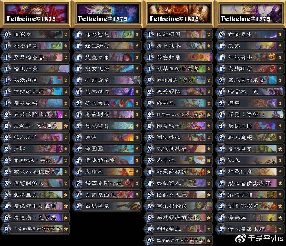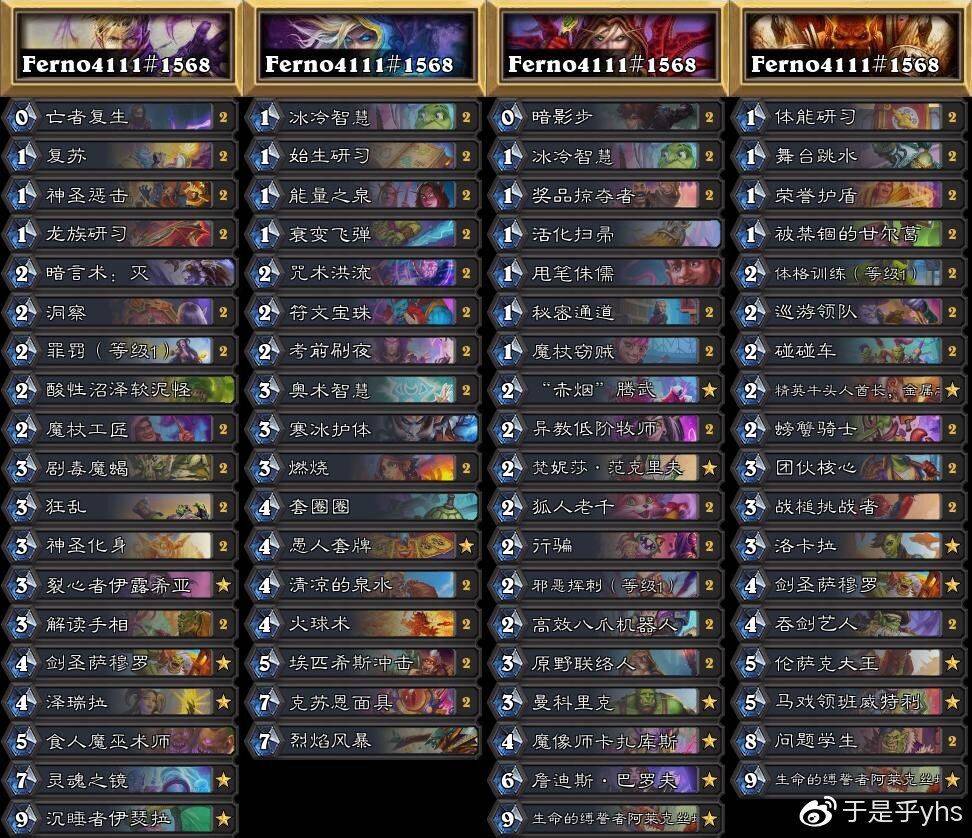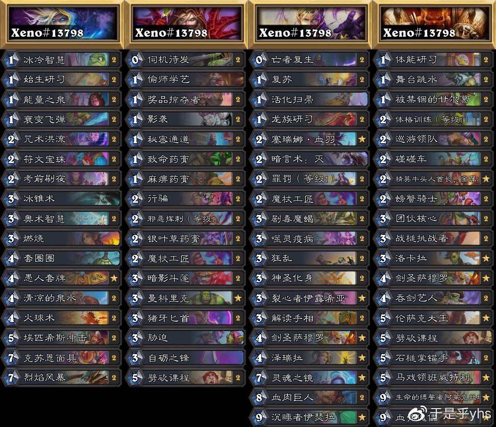 本次比赛,笔者觉得自己最大的背锅位是法师,虽然大数据上法师的胜率还算不错,但是如果运气稍差,就是一个三关,而且毫无操作空间,只能“人为刀俎,我为鱼肉”。也是笔者前三轮1-2的一个根源。但是综合来看,牧师还是吃ban最多的职业,法师、战士和盗贼的胜率也令人满意。所以笔者认为征服4ban1赛制下,比较合适的组合是法师、牧师、刀贼和战士。