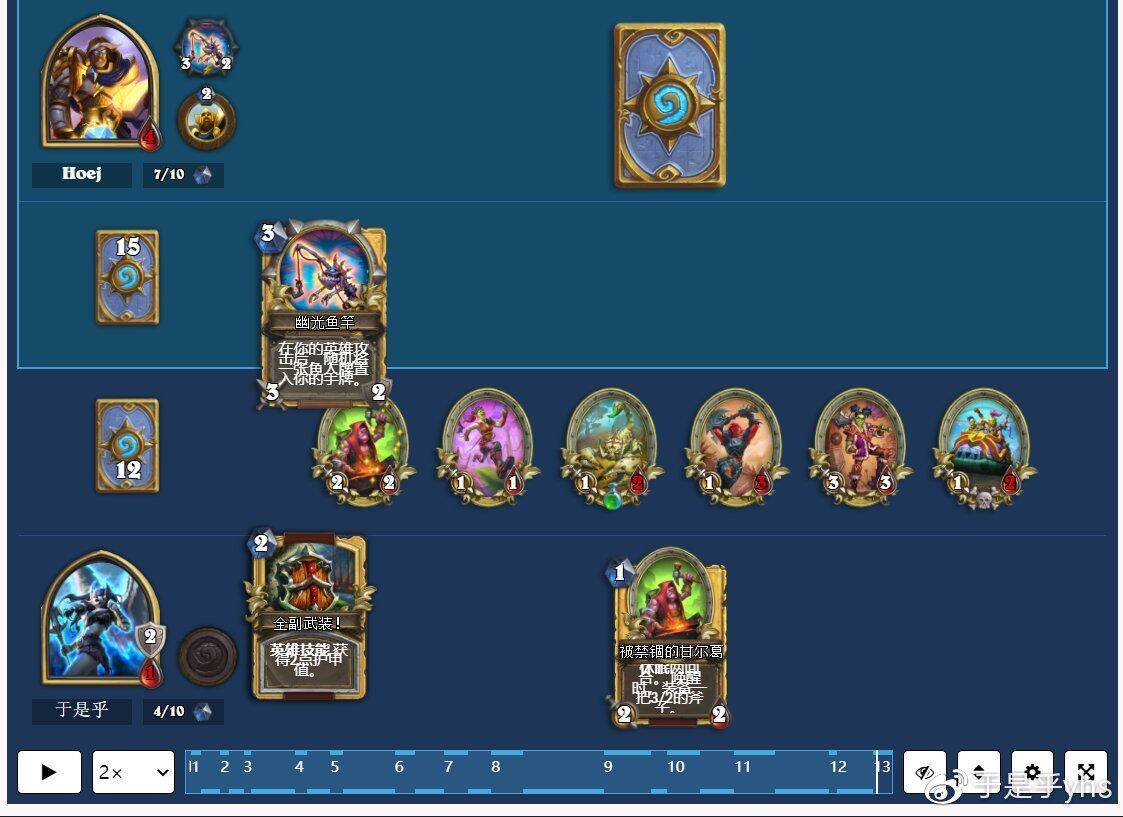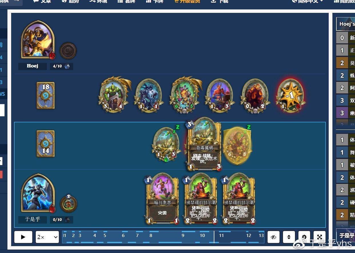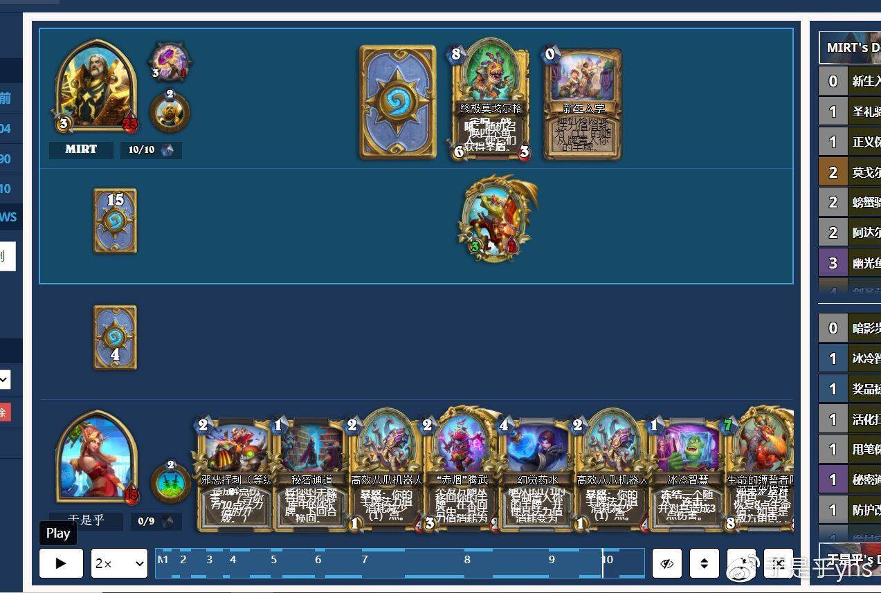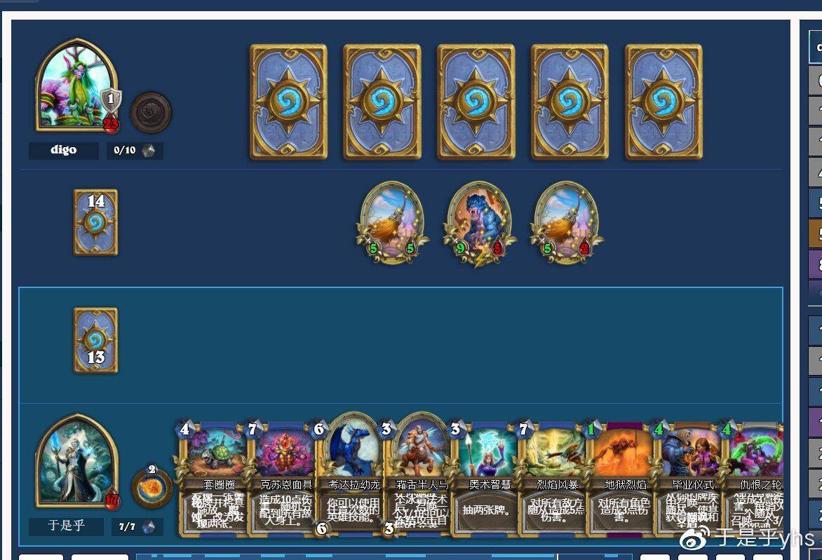 这里有三种打法,第一种是打毕业仪式(必拉977终极随从),然后打地狱烈焰,火冲点掉老虎。这样场面上对面剩一个5-1,笔者剩一个7-7的终极随从。第二种打法,打地狱烈焰和仇恨之轮。这样自己场上有两个3-3。第三种是赌命玩法,打奥术智慧,去找梦想。笔者觉得,977终极随从马上有费用可以打出来了,所以没必要占一个7-7的法强白板。更何况站住场了,如果对手打腐蚀过的小丑,笔者一样解不掉。所以笔者选择了第二种打法。给自己站了两个3-3,把对面全解。结果下回合,对手果然是满场8-8的小丑。