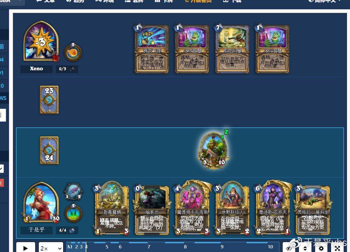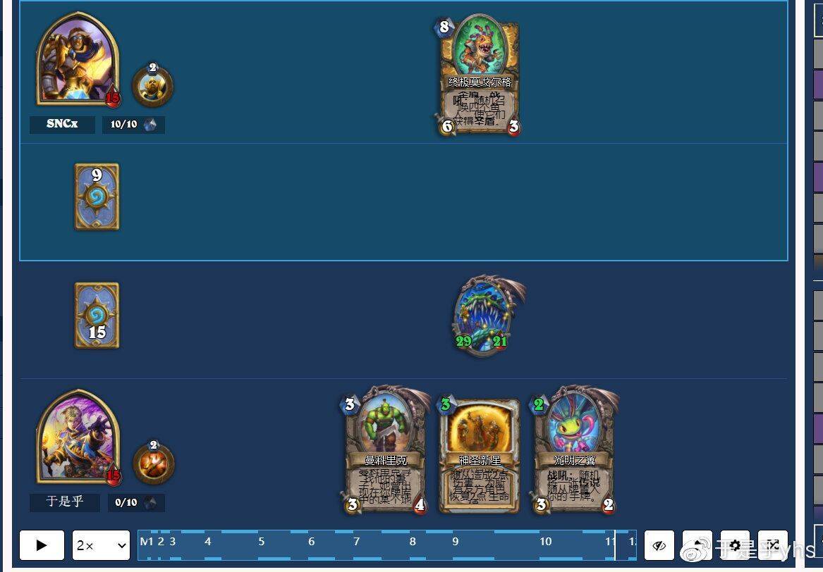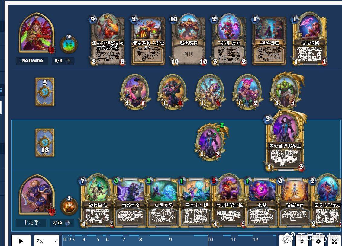 这轮对手的line up比较奇特,笔者研究了很久也看不出所以然。看似抓法师,但是法师打德鲁伊的优势还是很大的,看似抓牧师,但是却携带了t7猎这种卡组。于是笔者ban掉了对法、牧、战都有优势的刀贼,打了一个漂亮的2-0,就剩下一个法师。可是,笔者的法师遇到了一些问题。在输给猎人和法师后,遇到了保镖德。由于法师随从较少,德鲁伊的保镖对法师威胁不是很大。所以笔者也没放在心上。