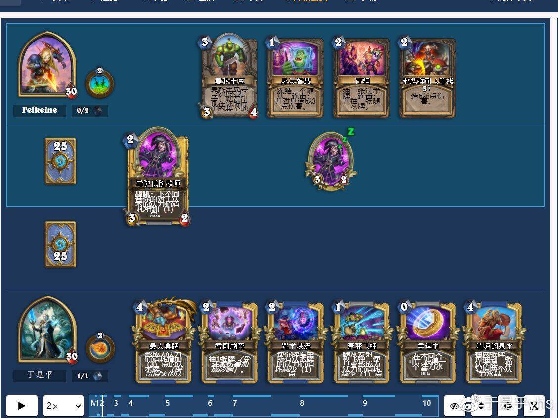 笔者ban掉了他的法师(因为他牧师带的比较薄),在笔者的法师对阵带有异教低阶牧师的盗贼时,笔者选择了较贪的打法,不硬币洪流,准备2费洪流,3费套牌,4费泉水启动。而事实上这样的弊端就是被232锁住了会导致节奏断层。结果对手在先手的情况下有232和曼科里克,前期十分顺滑。所以法师也输给了对手的盗贼。