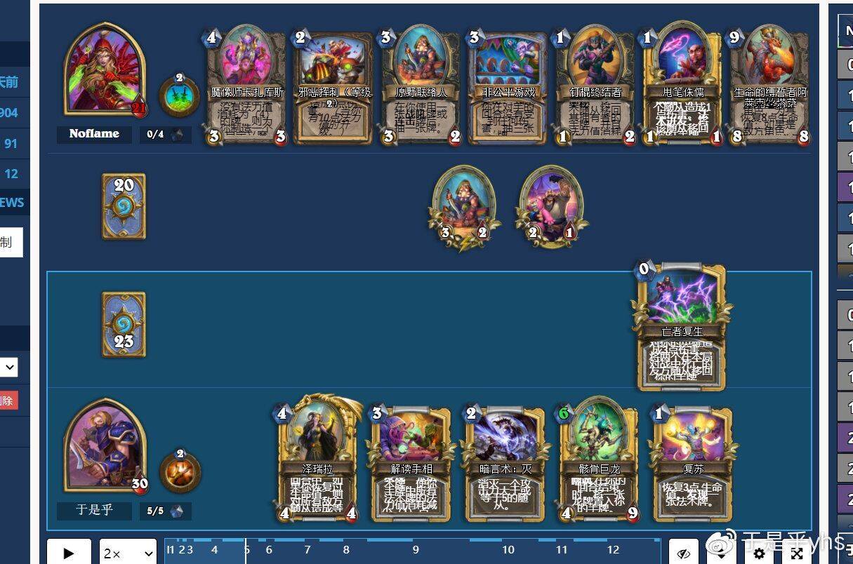 我们来欣赏一下牧师对阵奥秘贼的对局。在5费回合,笔者一开始觉得没有办法解掉原野联络人,于是想了很久,并打出了亡者复生加复苏的组合。在暗影形态、龙族研习、洞察这三张卡里选择了暗影形态,希望用英雄技能点掉联络人。但是在拿完牌后,笔者发现牧师的泽瑞拉亮了,这才发现用亡者复生、复苏、泽瑞拉正好可以解掉对手的场面,而笔者险些因为差一张洞察的过牌量而错过裂心者。