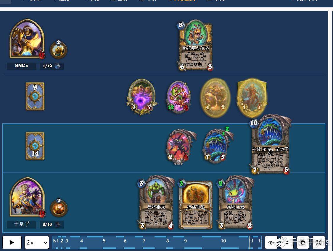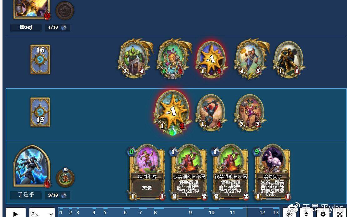 本来对手的10-10潜行笔者也十分难处理,很可能配合红龙就将笔者斩杀。但是在313被232换回来后,笔者通过洞察过到的剧毒魔蝎发现了一张“毁",在对手下了10-10后,亲眼看到了我发现的”毁“,无奈地发了表情,打得不错。