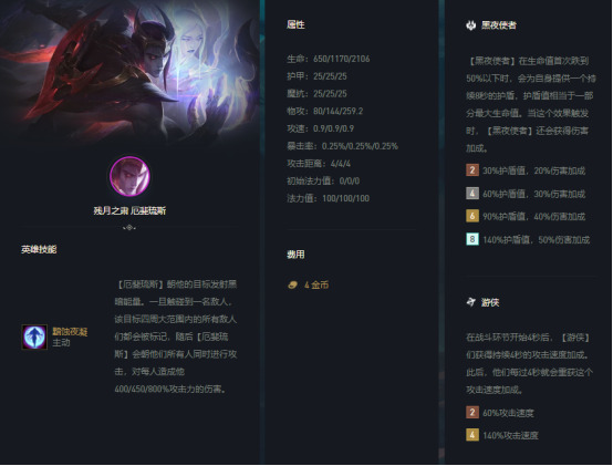 大家知道月男技能可造成4人超高物理伤害,之前摩昂也说过月男的几种出装思路3大核心装备思路——羊刀、杀人剑、轻语。这三种核心思路阵容搭配不同而选择也不相同。我这这局搭配的是4游侠,4游侠每过可增加180%攻速(上图为官网数据库资料,但有错误),月男是不算差攻速的,而版本现在3羁绊重骑兵、铁甲、骑士羁绊的选择上比复生算少了,也可不考虑轻语,我们就以杀人剑为核心,让月男的输出更暴力。