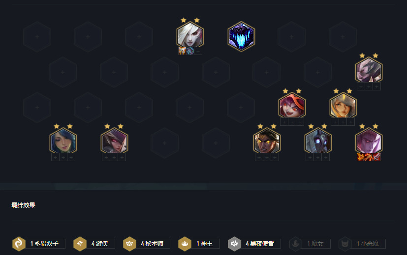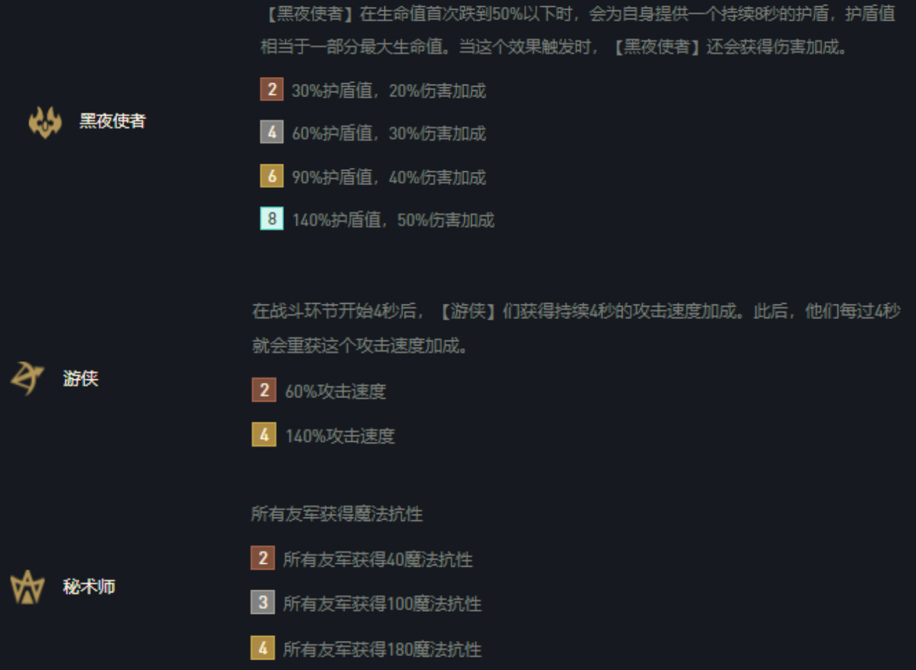 阵容运营关键羁绊:4黑夜+4游侠+2/3/4秘术。
