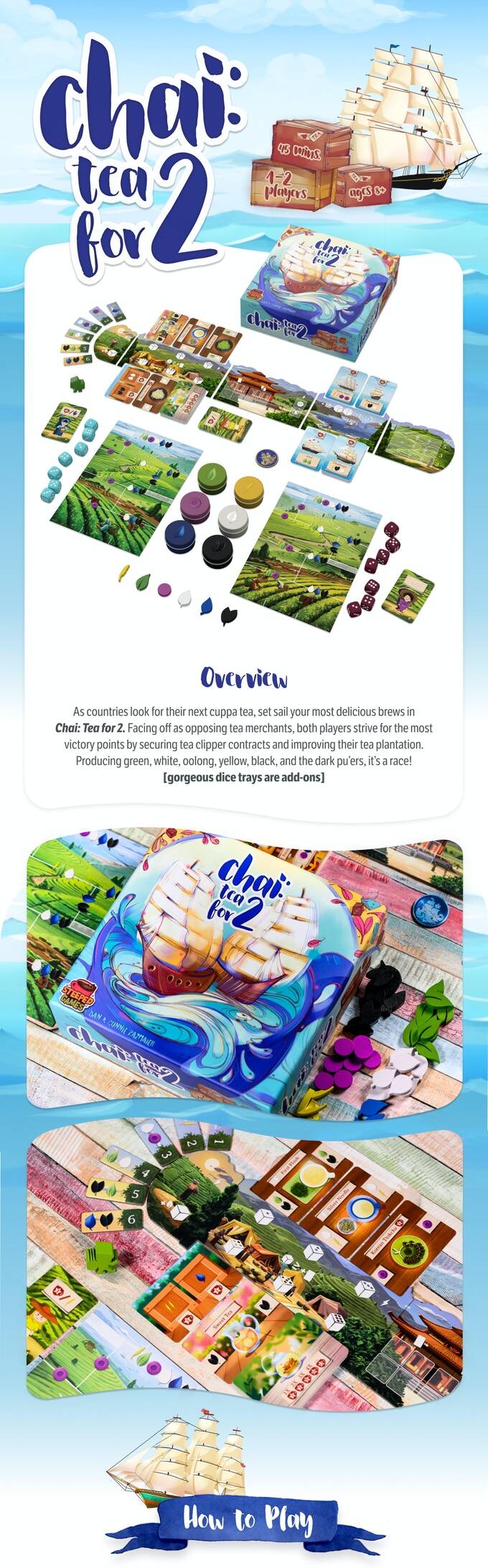 Chai本身是一款多人游戏,而这次众筹的是双人游戏版。本身Chai美术吸引了一批玩家,但实际游戏性更偏向亲子游戏,所以看一些玩家评论对Chai并不是很看好,而这次的双人模式延续了美术风格,给不同种类的茶配备了不同样子的指示物,非常贴心,但支持人数只有2人,游戏时长45分钟。