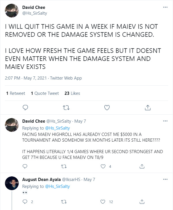 首席设计师Iksar昨天的推特发言还不仅限于每周固定的问答环节。这次把Iksar召唤出来的是外服顶尖的战棋玩家SirSalty,他洋洋洒洒写了一大篇作文,指出炉石战棋比起其他自走棋最大的问题在于伤害结算机制。Iksar读完以后回他回得也挺长,总体上表示了认可。