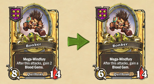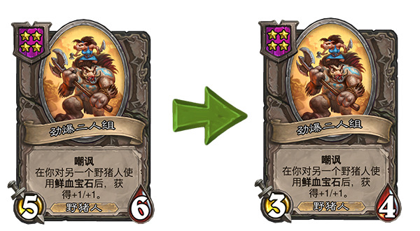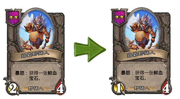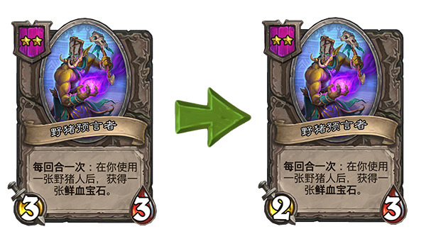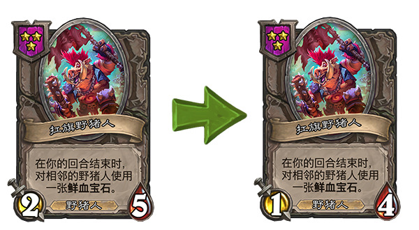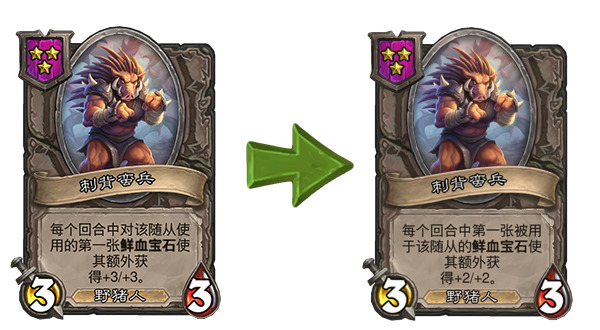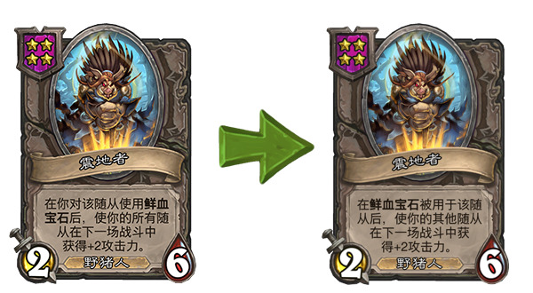 另外对于简中版本来说,这次补丁也把好几张野猪人描述里的错误表述改掉了,所有的“你对该随从使用鲜血宝石”的地方都改成了“被用于该随从……”,这样一来终于和实际的效果对上了(野猪人贴鲜血宝石的额外效果也可以由随从贴的鲜血宝石触发)。