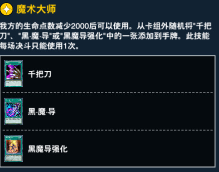 13级奖励,后续暗游戏也可以获得这个技能。配合布幕可以轻松达成发动条件,随机性导致不一定能拿到自己需要的那张。不过由于3张在黑魔导在场都是很强的卡,所以现在黑魔导卡组用这个还是没有错的。