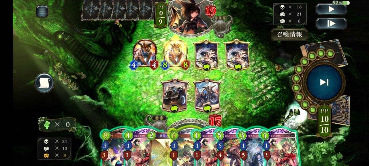 手牌是森林之狼2张、开花、牛仔、结晶的人马、猫姐妹、牧地巨人。