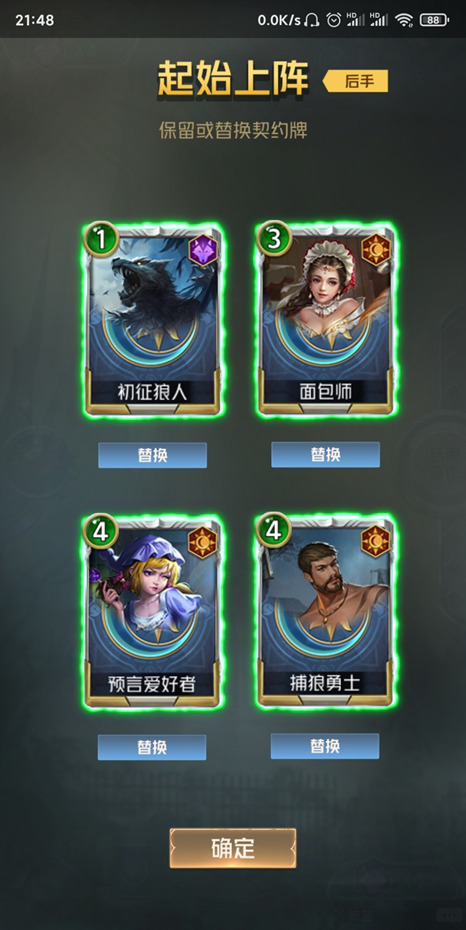 游戏开始时双方每人抽取4张卡牌,起手的4张卡牌都可以拥有一次替换机会),之后每个白天会根据场上空余位置随机从牌库补充卡牌,每次最多补充2张。