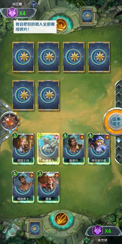 左边中间显示的是当前白天的第几个回合(双方白天共4个回合,黑夜2个回合)白天4回合之后进入黑夜,黑夜双方各可以发动一次狼刀技能,杀死狼刀指定的卡牌,如果有明面卡牌,必须选择明面卡牌,如果没有明面,可选择任意盖牌。