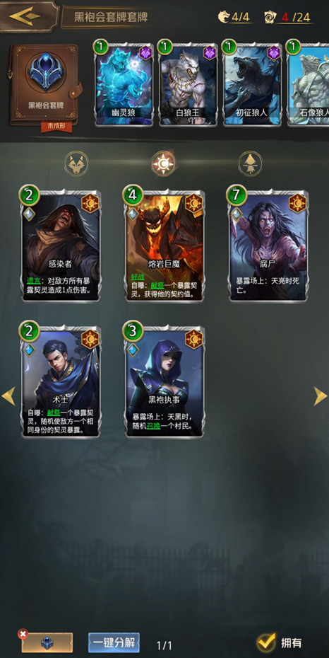 卡牌的左上角为该牌的契约值(即是生命值也是攻击值),右上角为卡牌所属的类型(狼人,神职,村民)