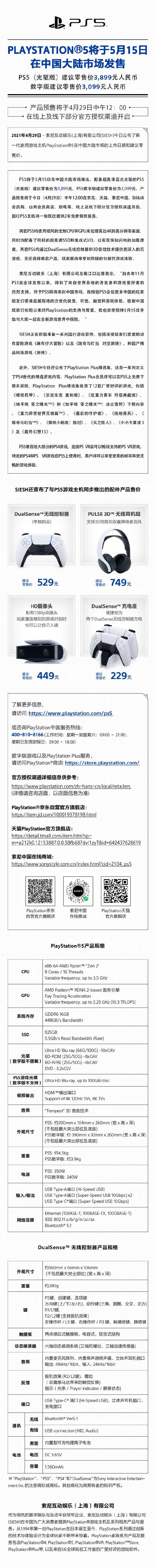 此外,DualSense无线控制器(单独购买)529元、PULSE 3D无线耳机组749元,HD摄像头449元、DualSense充电座229元。