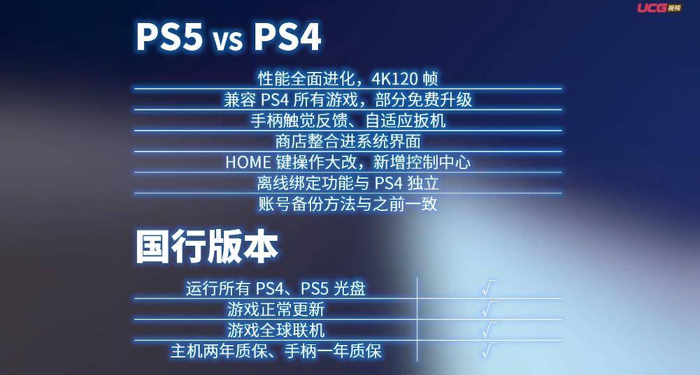 配置方面,国行PS5搭载AMD Ryzen Zen2处理器,8核16线程,最高加速率频率3.5GHz;AMD RDNA 2 GPU,16GB DDR6内存,825GB SSD。HDMI输出接口,支持4K 120Hz、8K。在原始设置下,机器只能选择中国区和登陆中国PSN账号,也无法以国行PSN账号,访问其他区域的数字版游戏,但光盘却没有这种限制。
