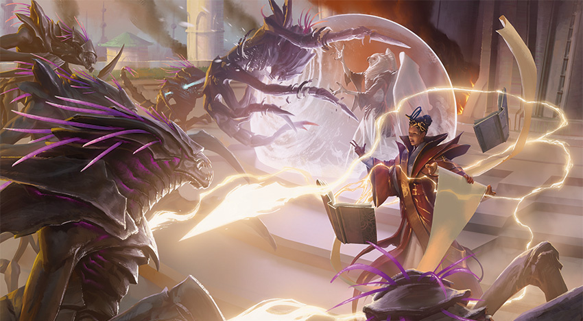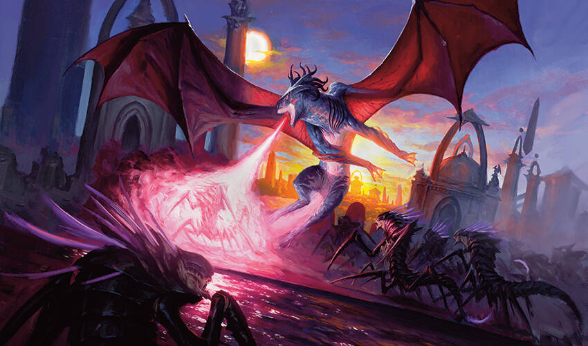 < figcaption >龙族干预|由Johan Grenier作画随着它们再次重新掌控自己的心灵,那些设法躲过巨龙袭击的猎法妖开始颤抖、抽搐。它们一起打响多量牙齿,伸出那些发光触须,并转向离它们最近的魔法养分来源:欧理可特务。在这些生物向前猛扑的同时,空气中又充满了新鲜的嘶喊声。