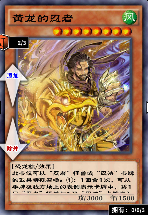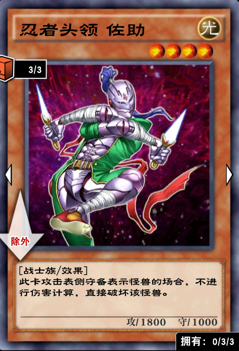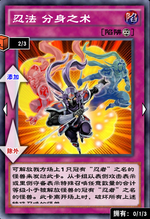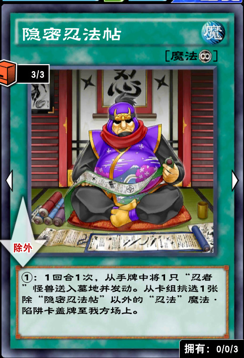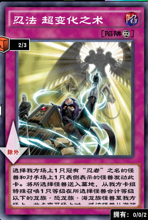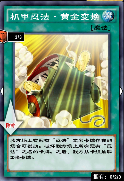 卡组二哥,投入1即可的上级,主要是保护自己的场上的忍法不会被炸,但是注意这卡在场上的时候别开黄金变换,不然会抽不了卡。