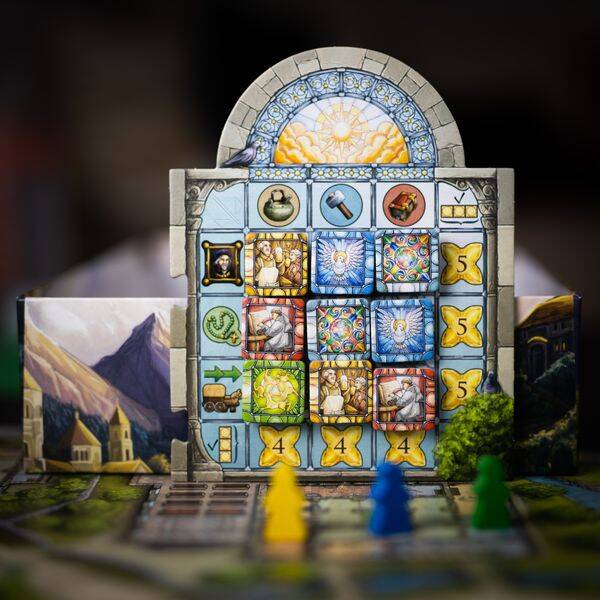 举个例子,这个游戏里有个获得额外资源的重要方式是拼彩绘玻璃花窗板块,以前需要费劲去给人家干活才能得到,或者靠信使在路上捡(听着就很不稳妥是吧?),而现在第3行的行动就可以让玩家直接从人家修道院里往回运了,当然前提是那个修道院的小圣堂里有自己人,所以说还是有人好办事啊~