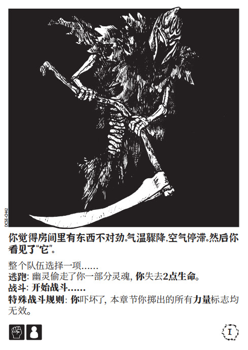 在这个章节中,只有翻开章节牌的角色不能使用力量。可以看成这个角色的骰子上所有力量标志都消失了。如果掷出了力量标志,就当做空白。如果掷出双倍力量,盾牌的标志依然有效,只是单纯进行抵挡。
