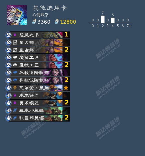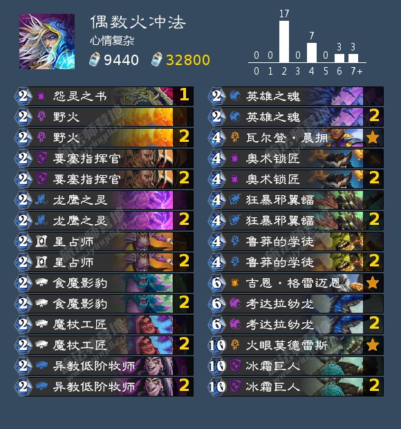 2星占师+1怨灵之书的搭配是原卡组的选择,我经过实战感觉这是一个相对合理的搭配,星占师能帮助你拿到至少1个野火,109场中怨灵之书也只有3场弃掉了野火,故而继续保留。