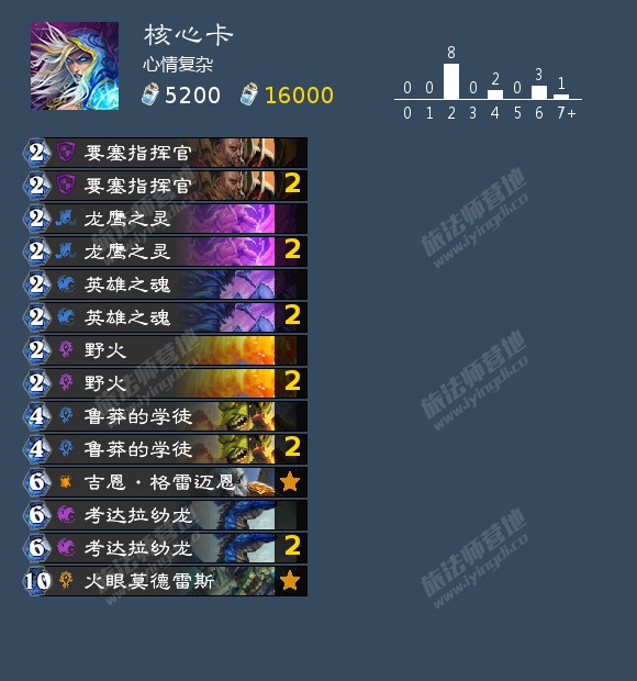 这其中比较有争议的是要塞指挥官和火眼莫德雷斯,就单独讲一下个人的理解。偶数卡组从4费开始就会偶尔浪费费用,而我们从4费开始大多为功能生物,不能为了打满费用裸拍,浪费费用的情况就更为明显,要塞指挥官可以很好地弥补曲线。此外,有龙鹰之灵配合为佳,即使没有,在技能升级1次后,无论是4伤打脸还是解怪节奏都还可以,嘲讽度巨高能干扰对面节奏甚至降智,能活下来还能有更大的收益,实战中大约一半的要塞指挥官都活到了第二天。