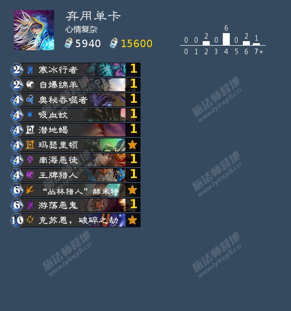 法师真是天命之子,尤其是冲分的前半段,基本都是火妖法,什么5费带你走都遇到了2次,实在离谱。这是一个天克对局,因为对面一定比我们快打死人,彼时还在用砸场游客,换成奥术锁匠应该会好很多。到了补丁后,火妖法完全还能玩,但数量少了很多,奥秘法成了绝对的主流。让人没想到的是,除非我们一个野火都拿不到,不然很容易在5费6费开始解光奥秘法的生物包括暗金教水晶侍女,奥秘法的直伤只有4个打6个、2个打3,如果血量还在15以上,再小心一点爆炸陷阱,加快铺场打脸的节奏给压力,就很容易个位数血量反杀,当然也有很多时候依旧会被直伤打死。宇宙法作为命最硬的宇宙卡组(大概),冰箱+雷诺稳定有两管血,这里就是上文提到火眼莫德雷斯对雷诺·杰克逊的counter作用了。这个对局需要玩命铺场打脸,有伤害就往对面脸上拍,除非保护关键随从否则不解场,尽快打死对面或者打出冰箱。对面打了雷诺·杰克逊一定要及时解,考古专家雷诺最好也解掉,不然遇到咖啡师林彻、蛇发女妖佐拉、幻觉药水什么的很容易崩盘。大后期注意不要all in然后吃了神奇的雷诺还铺不出来第二波就行,总体很少有打不死的情况。