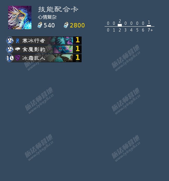 其实还有3张可以和技能配合的偶数单卡,分别是寒冰行者、食魔影豹和冰霜巨人。寒冰行者可以控场,配合龙鹰之灵或者鲁莽的学徒等于暴风雪,也可以冻脸来针对海君贼这样的武器职业。食魔影豹是非常好的填充物和卡组润滑剂,有费用就拍下,非常舒服。冰霜巨人配合鲁莽的学徒(龙鹰之灵不行)往往能够极低费用登场,尤其在对抗极限铺场卡组时能够一转攻势,即使没有配合,中期也能以一个舒服的费用登场。