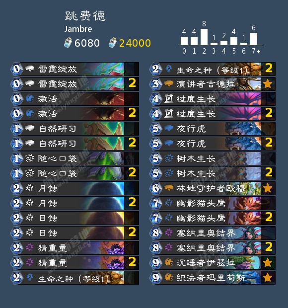 这是套构筑很复古的跳费德,带上了现在标准环境里德鲁伊所有超模卡。比较有意思的是带上了生命之种,配合卡组里的夜行虎和幽影猫头鹰3-4就可以拍上场(配合激活绽放或许可以更早)而且过度生长之后生命之种配合夜行虎这个combo,只要三费就可以拍出去。卡组的制胜点有两点,一是快速跳费后拍出沉睡者伊瑟拉和织法者玛里苟斯,伊瑟拉的额外资源和玛里苟斯抽出卡组的所有法术可以在费用优势的时候压死对手(日蚀+塞纳里奥结界)还有一种制胜手段就是潜行的夜行虎或者0费的幽影猫头鹰配合日蚀+树木生长的铺场combo。