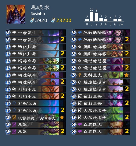 标准的黑眼术主要依赖前期黑眼和亡者复生和烈焰小鬼这样的牌配合,通过费用的回复快速铺开场面,用邪恶低语配合场面打出爆发。血肉巨人在中期5-6费左右就可以拍下场给对手压力,因为现在魂火退环境了,黑眼术的直伤不够,就更强调场面了,曼科里克和癫狂的游客都是前期优质站场生物。