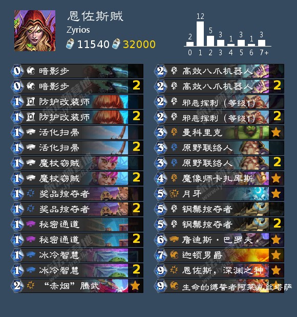 属于应最近恩佐斯骑的热度玩点骚的。和红龙贼几乎20张牌都是一样的,这部分卡是现在盗贼最超模的过牌体系和解场体系。在恩佐斯体系的选择上,Zyrios也玩了点骚套路,野兽是很难处理的月牙,属于单卡质量极高的牌。而迦顿男爵可以配合高效八爪机器人(机械)+钢鬃掠夺者(野猪)减费打伤害站场一起呵成。恩佐斯贼一直是花里胡哨的代表,从当年拉一地亡语的恩佐斯到现在的9费恩佐斯,盗贼玩恩佐斯最大的优势就是有暗影步这张单卡,可以多铺几波组织攻势。