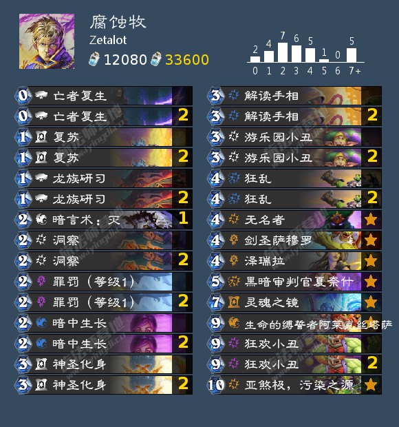 之前说过腐蚀牧最大的问题是腐蚀生物整体质量太低了,Zetalot干脆把腐蚀体系当成了额外的**体系。在保留了大量优质法术体系的前提下,选择单独带上狂欢小丑+游乐园小丑+亚煞极的体系。算是一套偏控制的腐蚀牧。