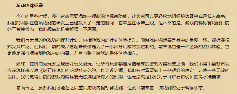 Iksar:很遗憾,你描述的这种自定义规则以及相关观战的功能,其实就是当年锦标赛模式的核心功能,它主要就是服务于炉边聚会的,让炉边聚会在现有功能的基础上还能允许旅店老板进行分组。本来我们还有拓展它的计划,结果(锦标赛功能)看了以后它也没下文了。那些UI和代码在倒是还在,但重拾起来的可能性也不大了,至少目前工期已经排到了2022年以后。