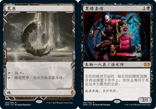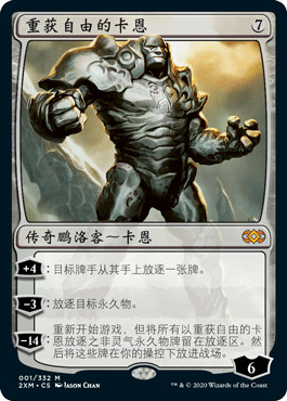 卡恩结算后就有足足6点忠诚,而且每次放逐对手(当然也可以指你自己)手牌就能获得4点忠诚,你还可以直接放逐掉任意让你觉得头疼的永久物(没错,包括地!)。如果你觉玩的不够爽,还可以让卡恩开大重新开始游戏。