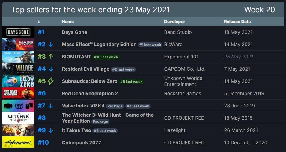 Steam公开新一周销量榜(5月17日—5月23日),新发售的《往日不再》成功登顶榜首,上周冠军《质量效应:传奇版》第二,《生化危机8》跌至第五,《赛博朋克2077》再次入围榜单。