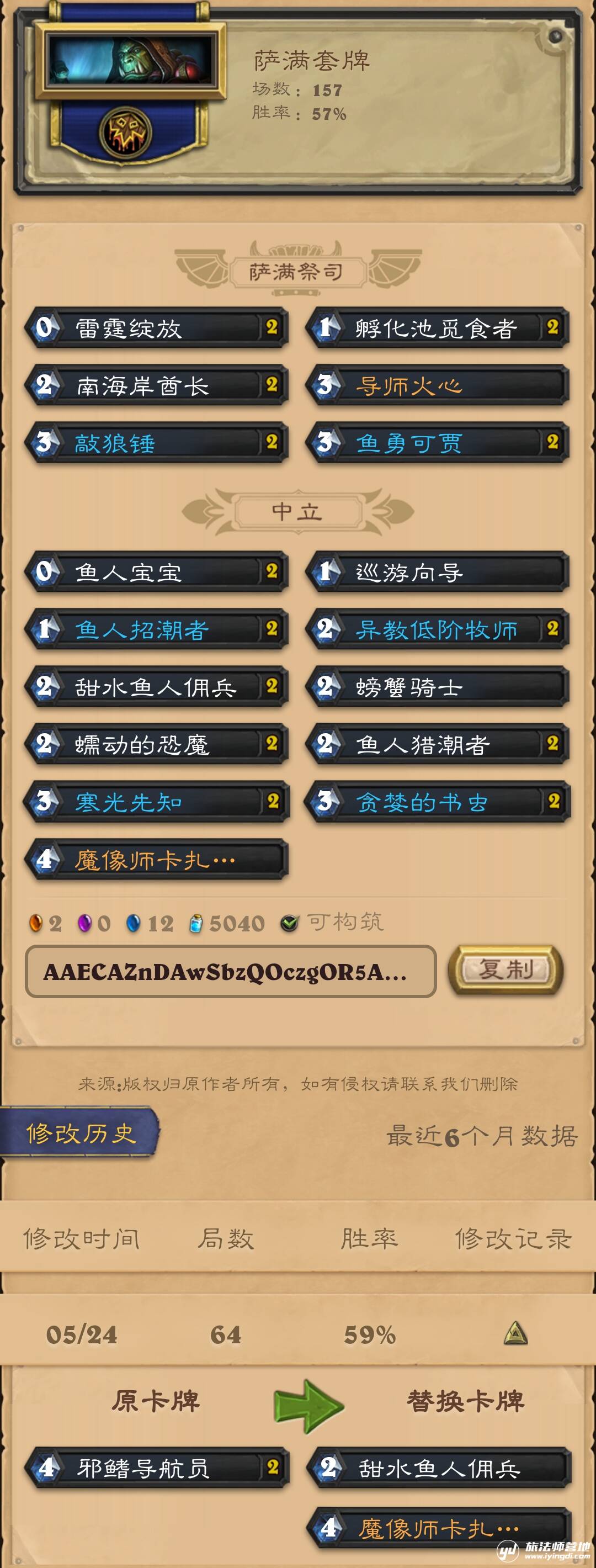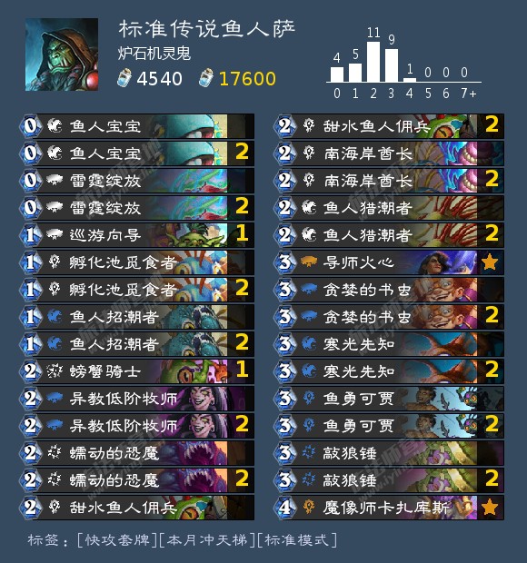 大家好,我是炉石机灵鬼,我又来给大家分享萨满了,这套萨满的构筑灵感来自于萨满这个下水道职业,因此有了这套鱼人萨,鱼人卡组是存在已久的卡组,由于中立池中有颇多的鱼人,几乎每个职业都曾能租出一套鱼人套牌,而萨满确实有几张质量不错的鱼人卡牌,比如鱼勇可贾,孵化池觅食者,南海岸酋长等,因此让我萌发了构筑鱼人萨的欲望。我使用这套牌157把,57%胜率从黄金9星慢慢打上传说,中途打出一波12胜并且经过不断的单卡取舍足以看出鱼人萨这套快攻的稳定性还是不错的。