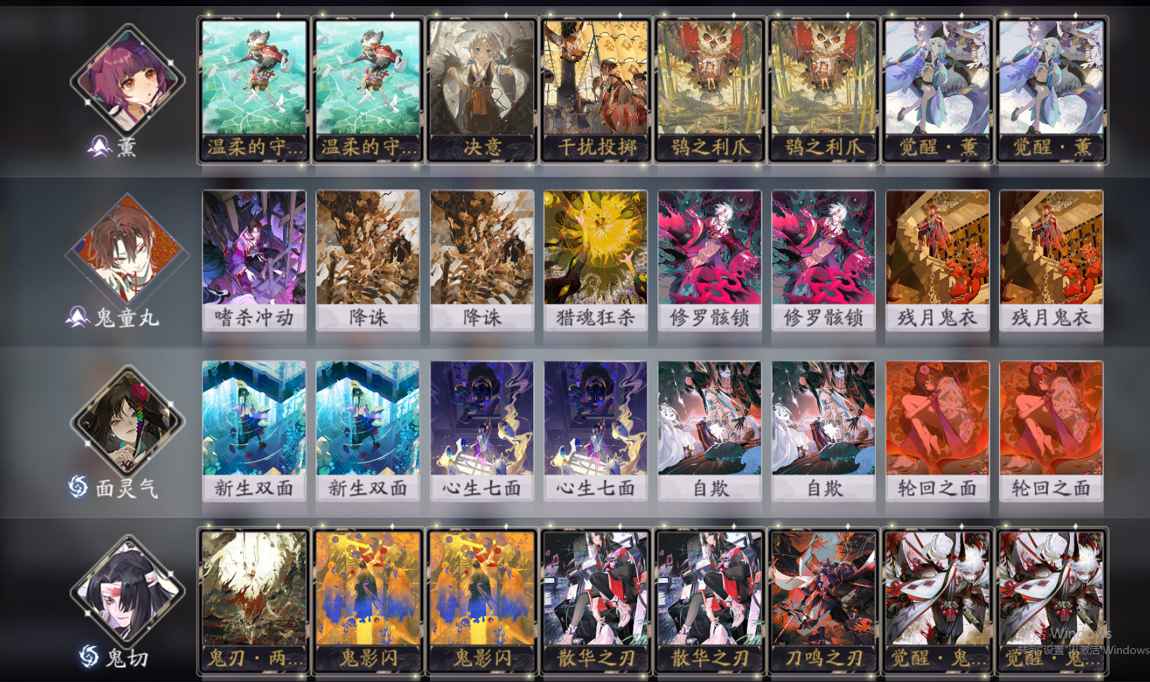 那么当确定了薰、面、切这个组合之后再来观察卡组的不足之处,想必就是缺少一锤定音的能力了。所以在最后我们需要补充一名擅长斩杀的式神。在紫岩和青岚派系中擅长这个能力的式神并不多,最后的人选可以出现在小鹿男、般若、鬼童丸这三名式神当中。横向比较这三名式神选择鬼童丸就是看中了他在三勾时残月鬼衣+修罗骸锁+降诛的强势。