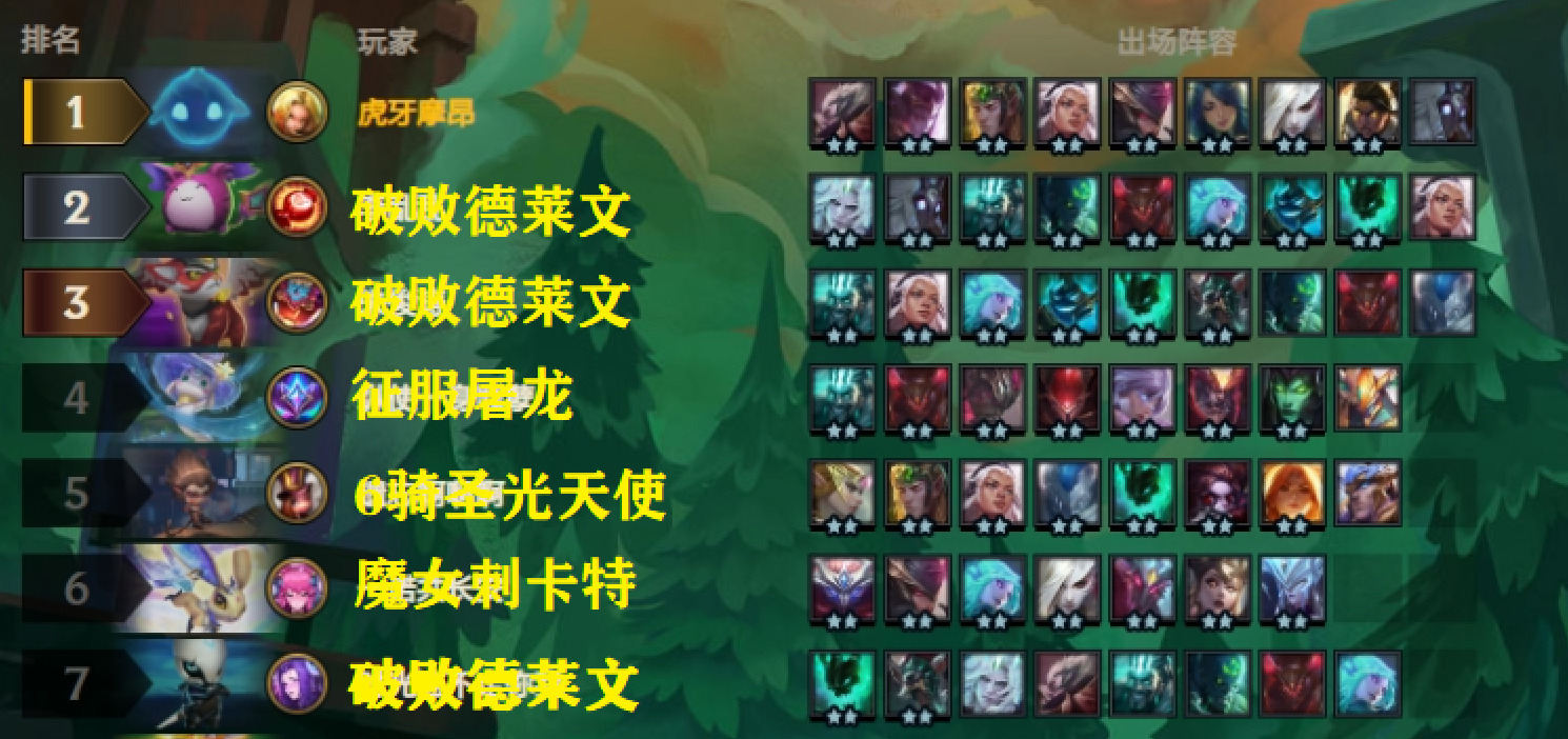 之后就根据打工阵容棋子慢慢像新黑夜4游侠阵容转换。保证2游侠的情况下,先保证前排质量,在慢慢添加4游侠。如果游侠棋子来的少或没2星形成不了战斗力,那么可以先上屠龙/双刺等进行打工。只要前排抗的主月男就能给你打出一个奇迹。如摩昂这局仅仅依靠人马与猪妹抗伤也拿到了6连胜。
