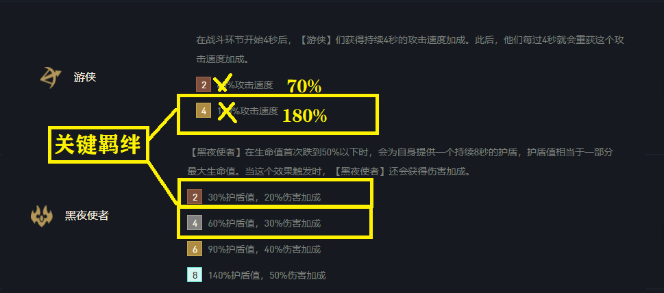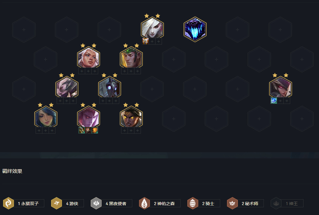 阵容运营关键羁绊:4游侠与2/4黑夜。阵容主C月男,副C莫甘娜、诺手、皎月、艾希均可。