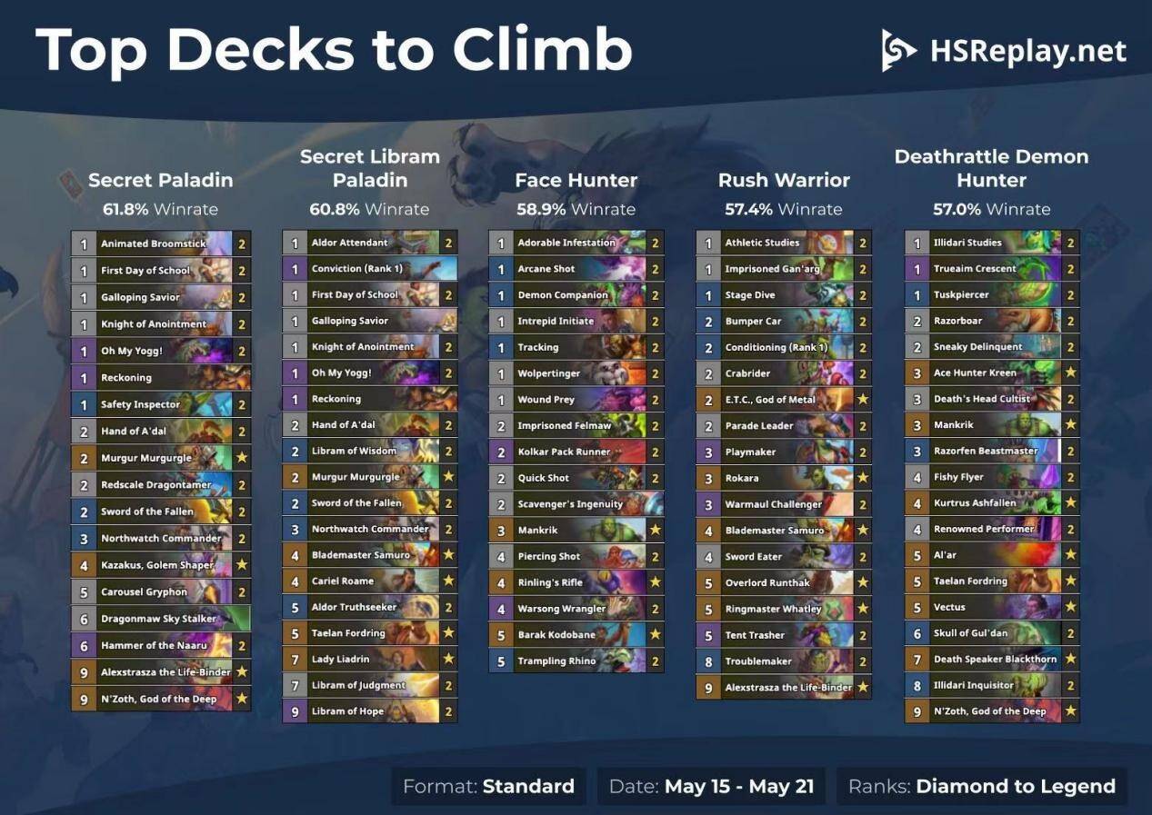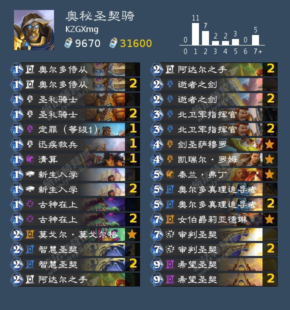 这套卡组是补丁之后,我5.15号上交战队联赛第三周卡组时构筑的,那个时候直接在hsreplay上抄了奥秘圣契骑最常规的构筑,然后玩了几盘之后根据自己的理解,将甩笔侏儒与正义圣契分别换成了定罪与莫戈尔,也算是自己的原创卡组(嘻嘻改两张就是我的了)。当然在后面的单卡介绍里会讲为啥我要这样改,在之后几天里我使用这套牌从200名开打打到第3,一共71把打出了70.4%的胜率,在战队联赛的比赛上也有着不错的发挥。