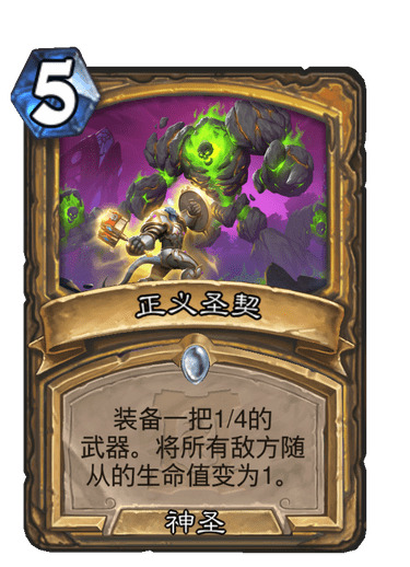 2、甩笔侏儒与正义圣契:这两张牌是大多数奥秘圣契骑都会携带的两张牌,自从萨赫特的傲狮退环境之后,不能稳定的过到甩笔与扫把,靠一张一张的抽上来我觉得比较的蠢,而且带甩笔侏儒最大的问题是需要它的时候不一定能够抽到,不需要它的时候就经常在手里卡手,特别是先手的时候等于手牌减一,对战控制卡组的时候就等于一张废牌还需要配合才能发挥最大作用,最最最重要的还是不能扎脸!况且在新生入学中也可以开出甩笔侏儒,所以我选择不携带它。至于正义圣契,当然配合甩笔是最好的,但甩笔只有一张,两张都有的时候不一定有小法术配合,还有一个不错的作用就是配合剑圣进行解场,但需要前期圣契减费才能比较舒服的打出这个combo,虽然这张牌有些时候确实有奇效,但我把它定义为一张卡手牌,所以不携带它。