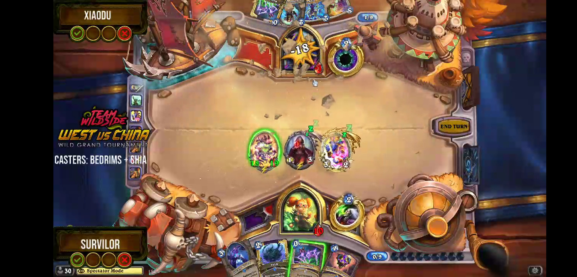 这次比赛带黑眼术的人不多,但八强里就有四个黑眼,证明这个卡组还是很强的。再分别分析中方和外方选手的黑眼术牌表,中方选手有一半选择了玛克扎尔的小鬼的弃牌体系并带上了强化机器人作为比赛终结手段,而外服则倾向于带罗姆和/或杰弗里斯,不过两边都没有人选择舍弃巨人带古尔丹之手、追求全力过牌找罗姆姐夫斩杀的快攻黑眼园构筑。