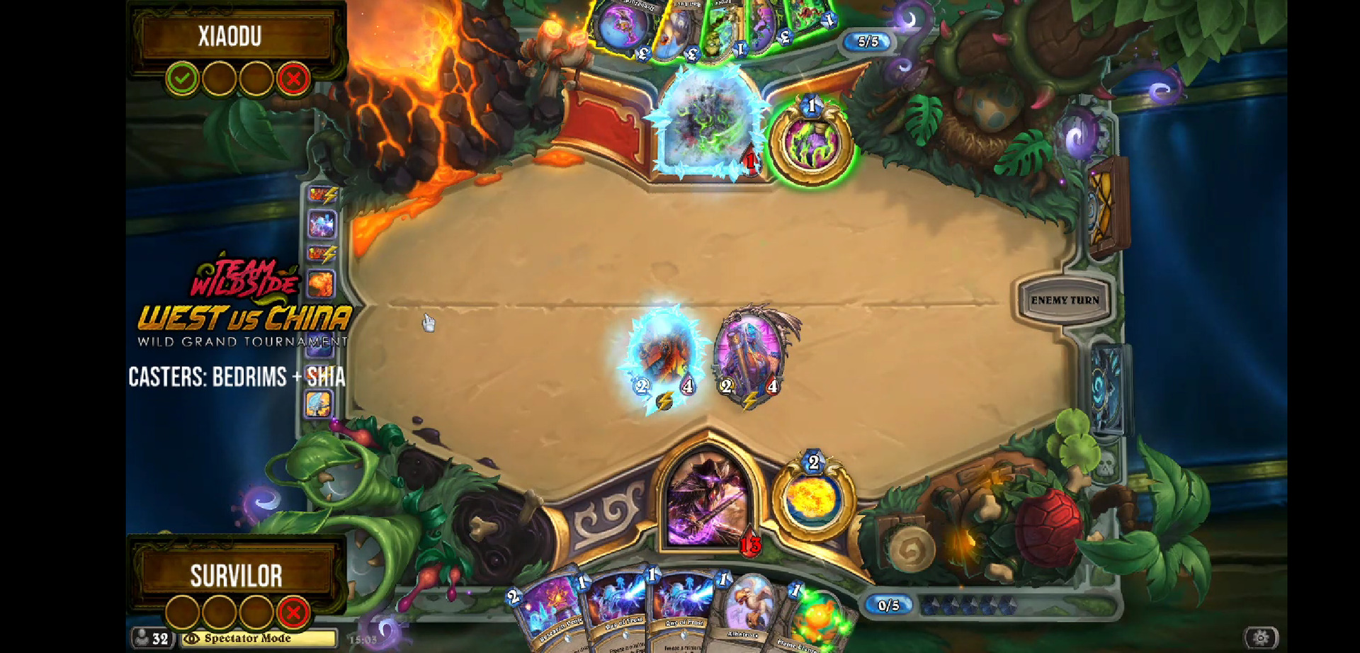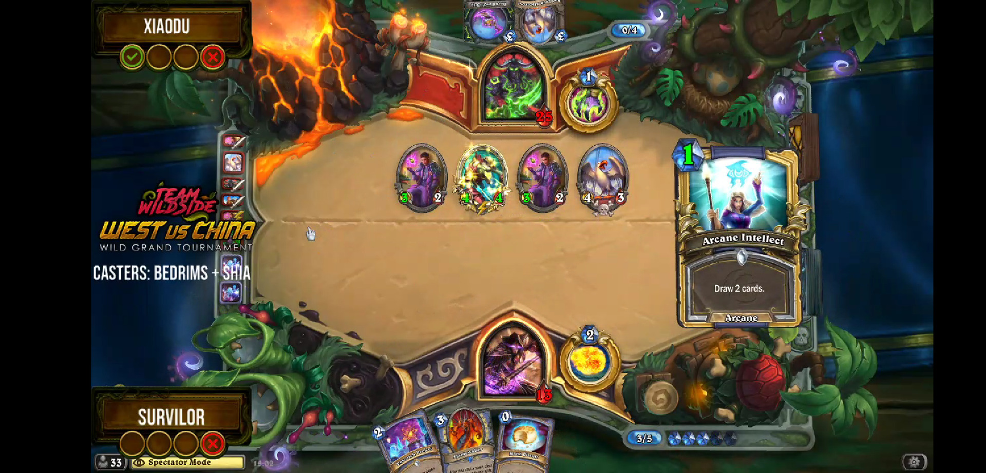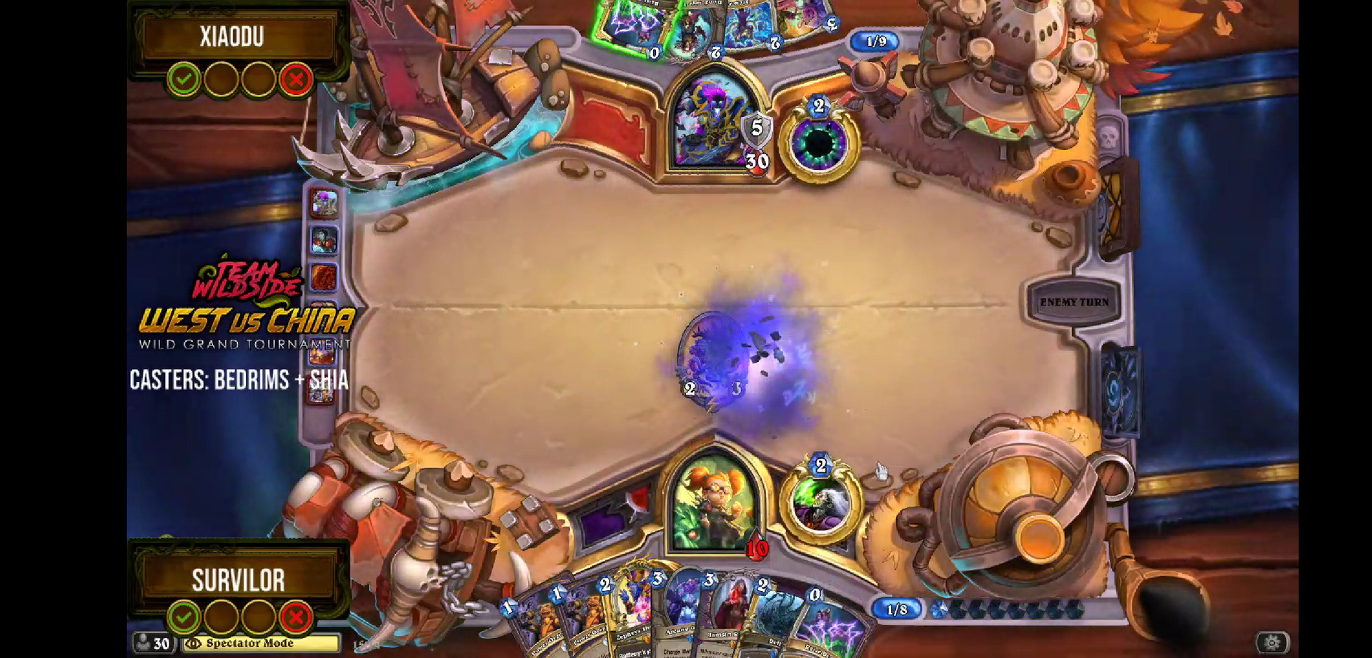 四强,Survilor火妖法对阵小杜奇数瞎。看到上面这张图你可能以为法师没救了。在小杜五费法力燃烧封魔场面叫杀的情况下,Survilor火妖法三费被迫强行启动,并神抽到了露娜,并完成了清场+打到1血反叫杀!
