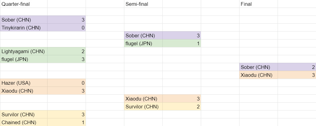 关于本届比赛的赛程其实安排的是有些问题的。有看奶粉解说或是国外解说台的观众可以看得出来,八强的选手发挥都非常不错,我个人觉得脏鼎打Survilor的那轮算得上是顶级博弈了,非常精彩;但到了后面的选手就发挥没有那么理想。夜神月和flugel的八强比赛是最后一组,而当时因为一些别的原因拖了很久,导致晚上八点开打的比赛拖到11:30才开始打他俩。这点而言确实是我们的锅,这也对选手非常不公平,下一届的话我们可能会考虑八强打一天,决赛打一天这样。