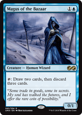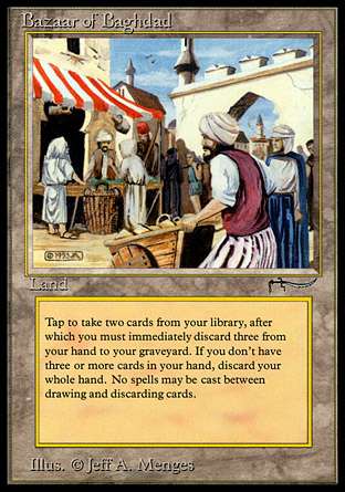 【巴格达市集】是特选发掘套牌的核心单卡,也是能让发掘在几乎没有P9的情况下不虚类似于矛盾路拉斯这种用满了P9套牌的关键理由。如此强大的地牌不出意外的在薪传被禁掉了。而【市集贤者】因为需要费用出,和容易被互动,完全达不到【巴格达市集】对发掘的贡献。如果你在其他赛制玩发掘或者掘坟套牌,你会更愿意用【丧信掠夺】和【细心钻研】;即使一定要用生物,【倒楣的研究者】或者【维林逸才杰斯】也是更佳选择。