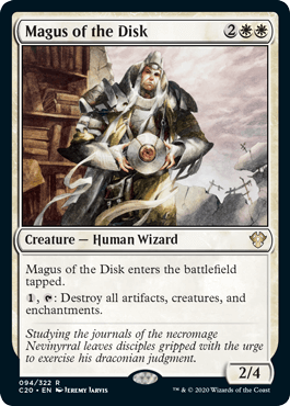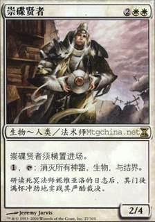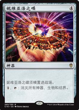 【妮维亚洛之碟】是早期万智牌常用清场,可以说非白色的控制套牌个个都用。而【崇碟贤者】由于容易被去除互动就没那么高地位了。笔者从没遇到过出这个生物的对手,可能只有笔者自己在几年前玩过“启动【崇碟贤者】异能,在堆叠上用【神秘插曲】把自己的生物全飘走”这种花活?