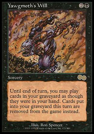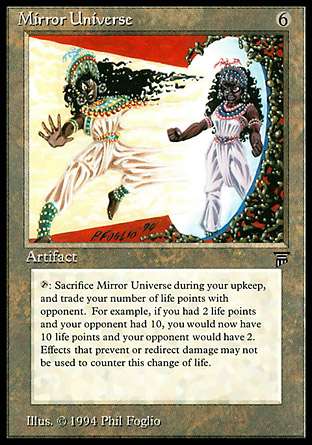 这神器当年还是很可以的,配合同在传承的【森林图书馆】表现不错。本可以和【死冥权能】有更好的配合但是【死冥权能】去找【雄伟幻影】玩了。随着【捐赠】在【天命之战】被印出让死冥捐赠套牌成为完全体,【镜像宇宙】再也没有在构筑混下去的理由了。不过现在有【Old School】赛制,这张牌能时不时能看见,但是这个生物去不了old school玩,在高费牌越出越强的近现代万智牌毫无机会。威世智似乎没有死心,在【依夏兰】又印了【凡命旋轴】。由于和【幻灭时刻】出的【肃然致哀】以及【核心系列2021】又出的【九命护身】同为白色结界,使得这个组合技成了先驱勉强成立的套牌。