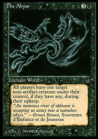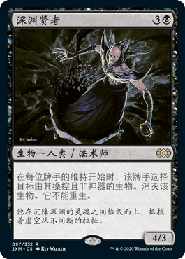 由于这个异能在空场的时候会**自己,所以【深渊贤者】被给予了这一组贤者中最好的身材。和【护城河】类似,【黑深渊】也是又昂贵又弱小的老牌代表。即使你真的想要一个持续跳楼的效应,上期提到的【蜂蜜滴】和【斑岩筛检】也是更好的。