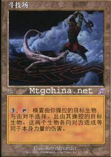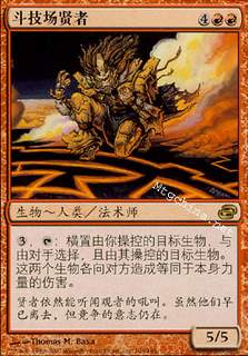 如果没有地配合,这种真·不能产费的地大致相当于一个不要费但是占用了下地机会的神器。而【斗技场】本身的强度远远弱于先前提到的【潘卓欧谷大礼拜堂】和【巴格达市集】。这张牌本身是万智牌推出的第一张杂志牌,而强度不太高也避免了这种限量发行的杂志被哄抢炒作。(现在的新手包旅法的强度不足以进入构筑,也是这种考虑。)不过,当时也有人尝试用一些,毕竟一个能持续去除敌人生物的永久物,就算很僵硬,也是有价值的。在【聚流】刚印【圣物骑士】的时候,又有不少人尝试往【圣物骑士】套牌里投入一个【斗技场】作为工具箱,不过很快就因为太弱被踢掉了。而【斗技场贤者】在限制就比较强势了。由于自身有尚可的身材,如果敌人都是小生物,就会被逐个解决。【斗技场】的英文名“Arena”也真的和万智牌很有缘,威世智公司干脆把新时代的主力产品定名为“Magic the Gathering Arena”了。以至于我想查这张牌当年的牌表时颇费了一番功夫……