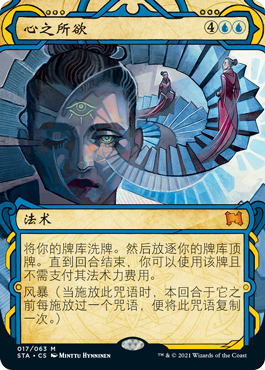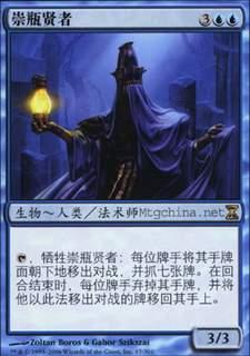 第三张是来自【C17】的【心灵贤者】,其原型【心之所欲】虽然同样是薪传禁牌,但是硬实力比不上前面那两位,且不说特选不限制张数,威世智甚至敢让这个牌在史迹合法!这张牌费用很大,有的指挥官能做到不真的付6个费就把这个生物弄进场。在这种指挥官套牌里,这个贤者的表现也许就比它的原型【心之所欲】还要好了。