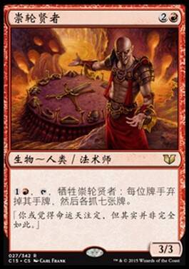 第一张是来自【C15】的【崇轮贤者】,其原型【命运之轮】的强度和作为“P9”的【时间扭曲】不分伯仲。和【时间扭曲】一样,【命运之轮】也是特选赛制TES套牌的关键单卡。同样和【时间扭曲】一样的是,【命运之轮】在指挥官赛制也是合法的。因此需要这种效应的总归会先用上【命运之轮】,如果还需要更多,会用【宿命之轮】【重塑灵魂】【厄运之轮】等,还不够才会考虑【崇轮贤者】。